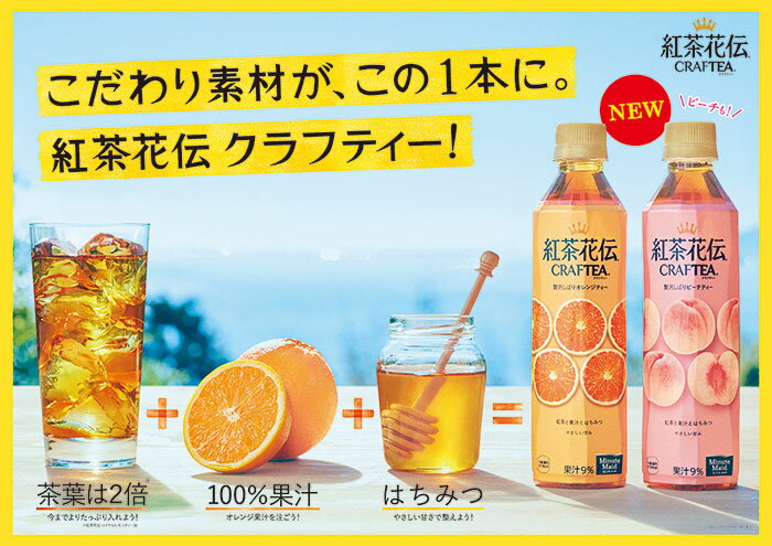 「紅茶花伝 CRAFTEA(クラフティー)」は、茶葉2倍*の香り豊かな紅茶に、おいしいところを絞った果汁を9%使用(*紅茶花伝 ロイヤルレモンティー比)。